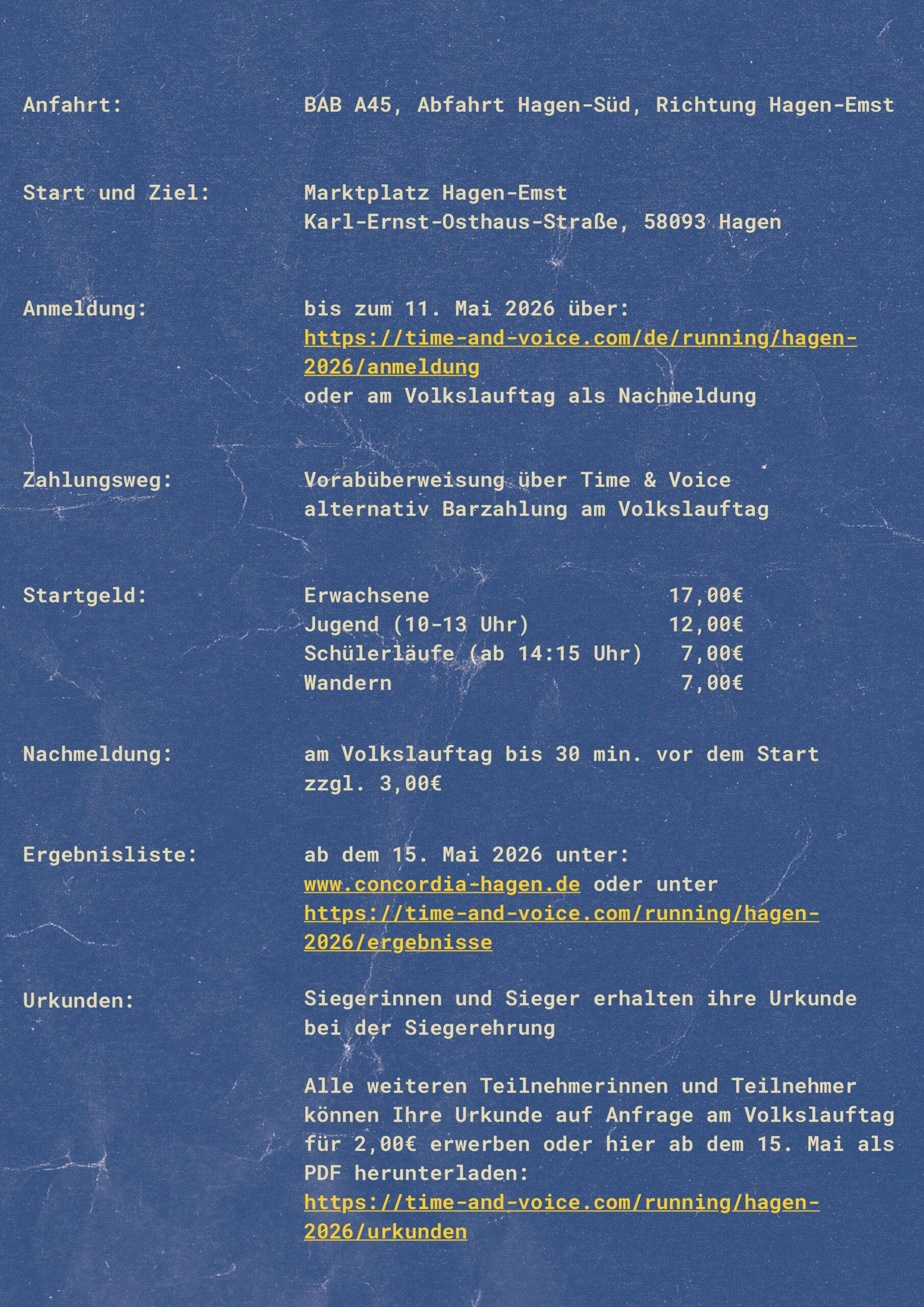 Registriere dich für unseren Volkslauf bequem über unseren Partner Time & Voice, der sich um sämtliche organisatorischen Belange wie Anmeldungen, Zeitnahme, Startunterlagen und vieles mehr kümmert. So kannst du dich voll und ganz auf dein Lauferlebnis konzentrieren. Nach dem Lauf kannst du die Ergebnislisten ebenfalls auf der Veranstaltungsseite von Time & Voice einsehen und deine persönliche Urkunde downloaden.